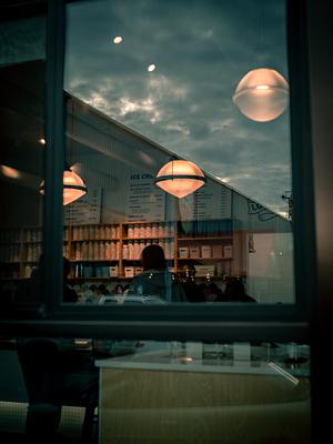 Small ice cream shop in Duluth, MN. This photo captures people in line at an ice cream shop. The clouds in the reflection of the window add depth to the photograph.