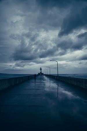 This photograph captures the unique character of Duluth, Minnesota, with dark and gloomy tones and dramatic reflections of the light poles.